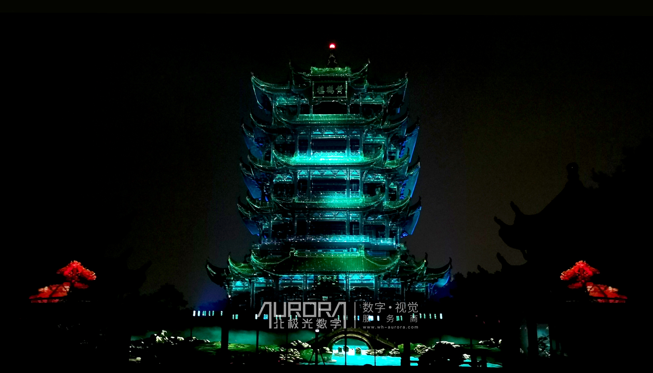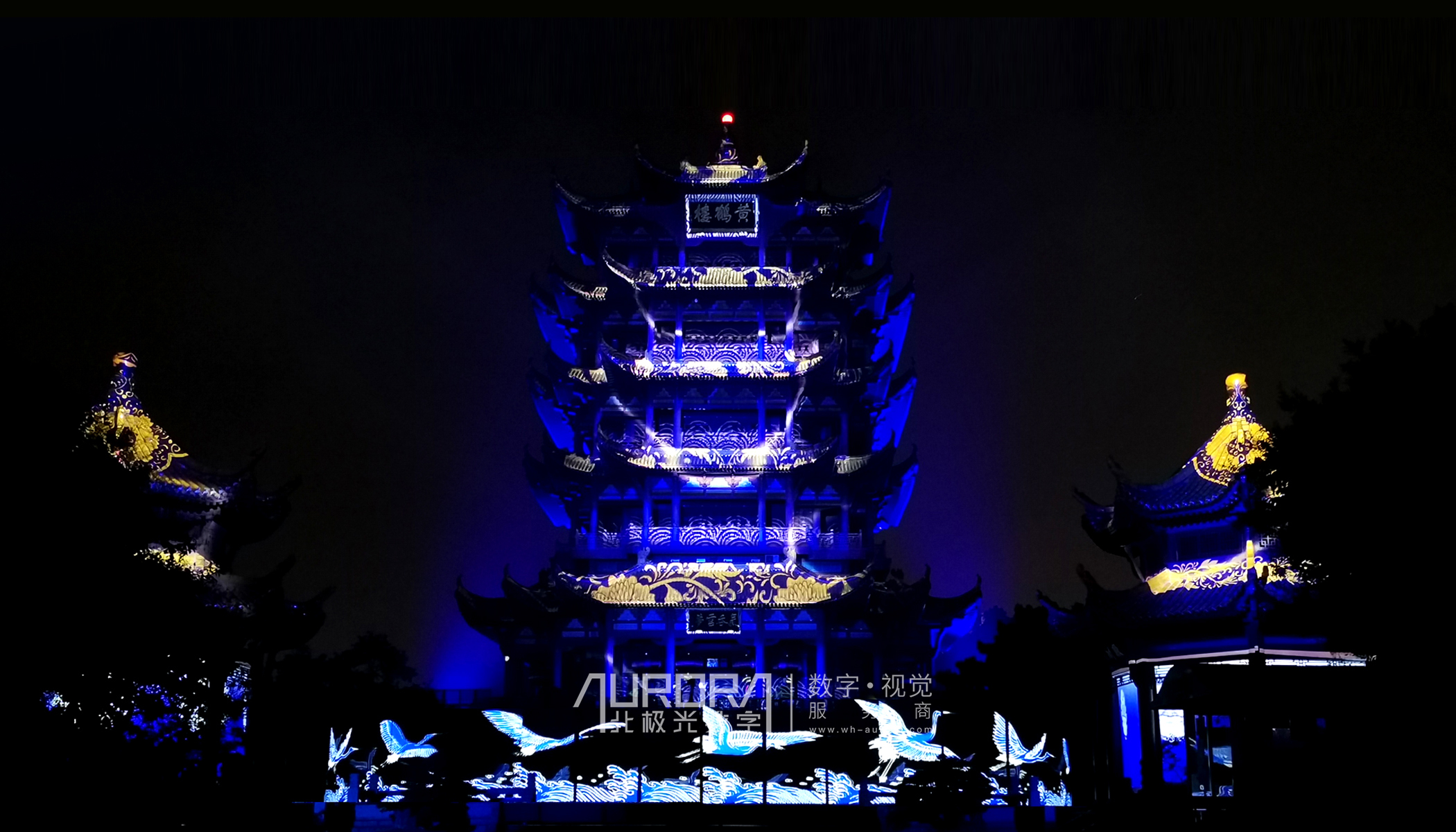 极光造梦,点亮黄鹤之巅,融合厚重史韵与世间繁华,将此千年城市发展岁月,化作一曲光影礼赞。12台巴可UUDX-4K32数字投影机,1500㎡超大视效投影面,楼体形态精准对位。史诗级裸眼3D mapping秀,魅力光影点亮夜色繁华。